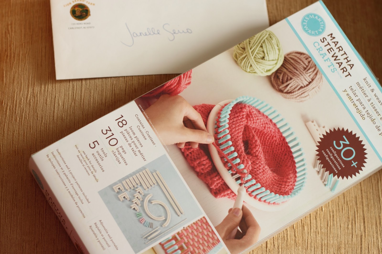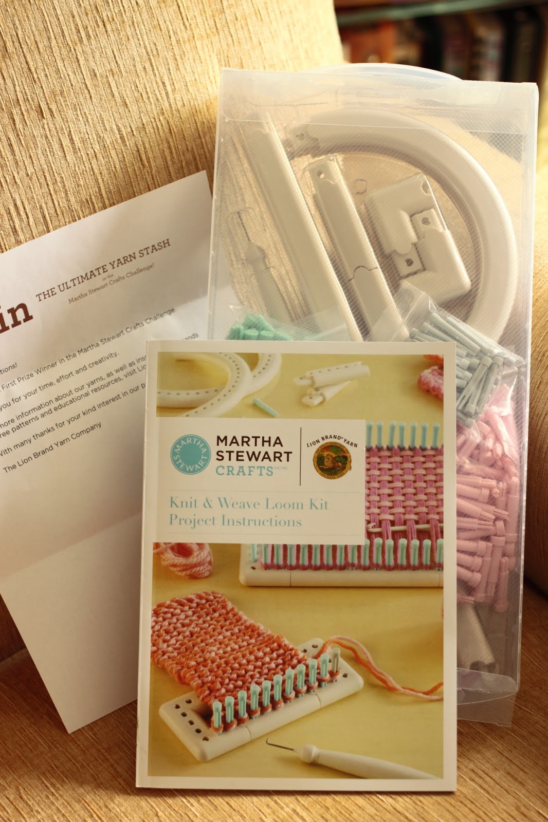 I received a Martha Stewart Crafts by Lion Brand Knit & Weave Loom Kit, complete with an instructional book on how to use it for some basic knitting and weaving.