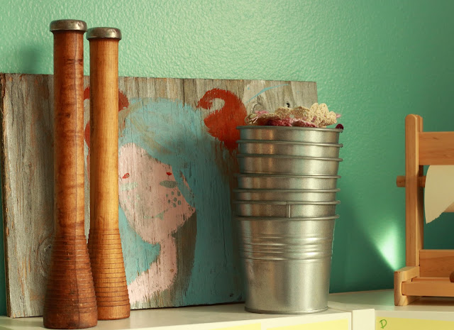 A friend of mine picked up these old spindles from Pendleton Woolen Mills in Milwaukie, Oregon as a suprise! I love their antique feel! And the painting on wood was done by my daughter, Annie, who took an art class last summer from our good friends Curtis and Michelle. Curtis\’ own art can be seen here and here! If you are local, check him out in Portland, Oregon!
