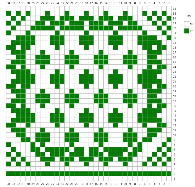 Switching to larger circular needles and, using stranded knitting technique in MC and CC, knit color chart. (The chart repeats three times around the hat.) Do not break yarn once chart is completed. (47 rounds completed)