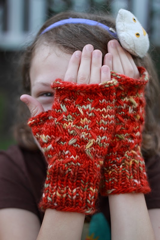 Of all the newly discovered fingerless mitt patterns, very few were exactly what I needed, but they all had great potential. So upon getting home on Wednesday afternoon after one particularly successful yarn shop adventure, I dug in. I knitted one pair exactly as written, then the next three I changed a bit for the individuals I had in mind for the patterns.