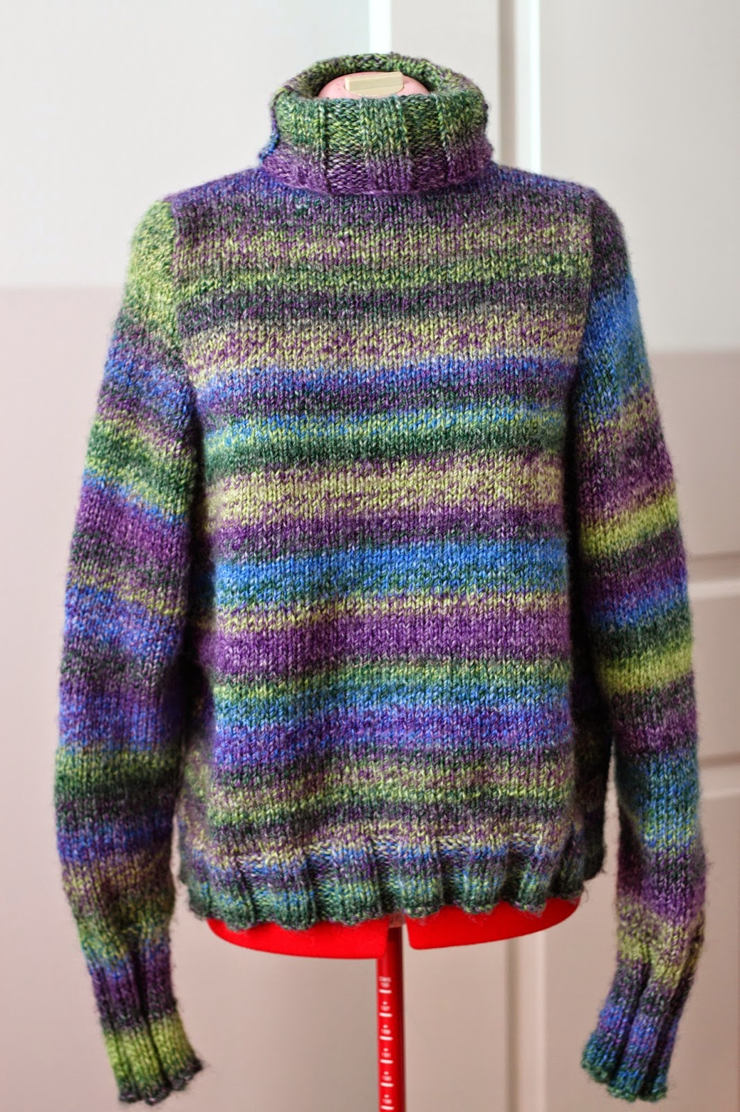 The piece is designed symmetrically in stitch count from top to bottom, with evenly spaced eyelet rounds and a central garter stitch band, so I did the same with the colors.