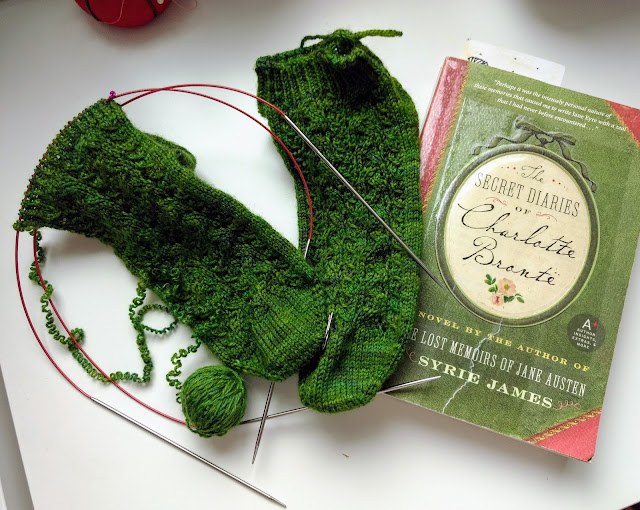 Back on Track: Anyway, I made one sock — many of us know the pain of the one sock syndrome — and the one sock was gorgeous. It is bright green merino and silk from Araucania Itata and oh how lovely is the sock pattern in that yarn! The textures just jump out!! And back when I made it, I was just learning toe-up! Chrissy\’s instructions were so good –and I such a blind follower — that it actually turned out! I admire the one sock from time to time, from where it sits in a basket atop my desk, enclosed for safety in a ziplock baggie, lest the bugs get it.